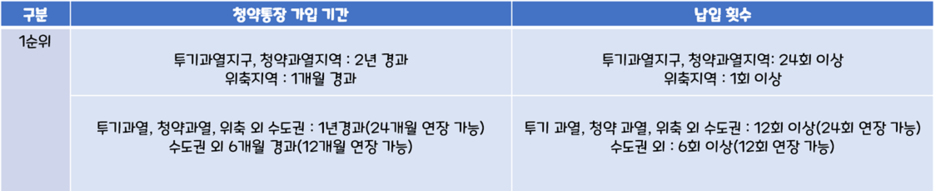 1순위 요건이 너무 쉽다고 생각할 수 있을 것이다. 물론 쉽다. 가입만 하고 2년만 참고 납부하면 쉽게 1순위가 될 수 있다. 이렇게 많은 사람들이 1순위이면 문제가 발생하기 때문에 우선순위 요건이 있다. 이것을 잘 해결해야 한다.