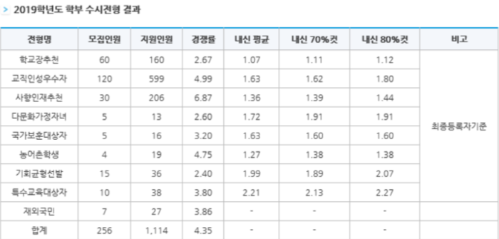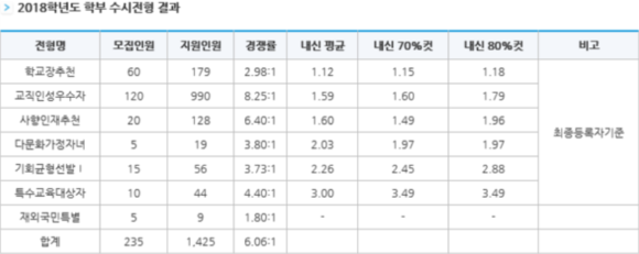 | 연도 | 모집인원 | 지원인원 | 경쟁률 | 내신 평균 | 교과성적 70% 컷 |