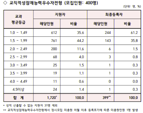 | 연도 | 지원자수 | 선발인원 | 경쟁률 | 최고 학점 | 평균 학점 | 최저 학점 |