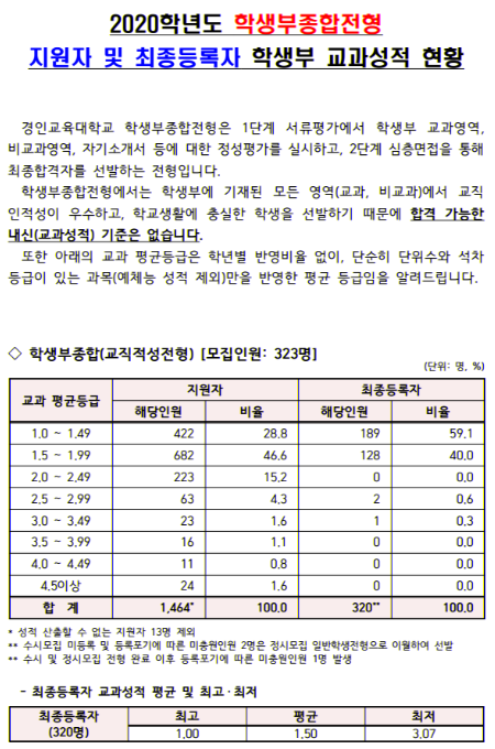2020 경인교대에서 다른 전형들도 많이 있지만, 대다수의 인원을 선발하는 학생부종합(교직적성전형)을 집중적으로 보겠습니다. 지원자는 총 1464명이고 선발하는 인원은 총 320명입니다. 최고 성적은 1.00이고 최저는 3.07입니다. 평균은 1.5임으로 한 1점대 후반까지는 지원할 수 있을 것 같습니다.