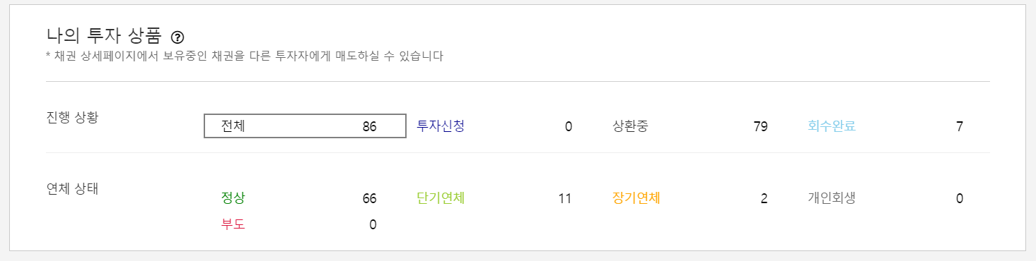 총 86개의 상품에 투자하였고, 상품마다 투자한 가격은 많이 다릅니다. 일단은 현재 장기연체는 2명 정도 있고, 단기는 11명 정도 있습니다. 이 11명 항상은 수시로 왔다갔다 하기 때문에 대부분 바로 갚습니다.