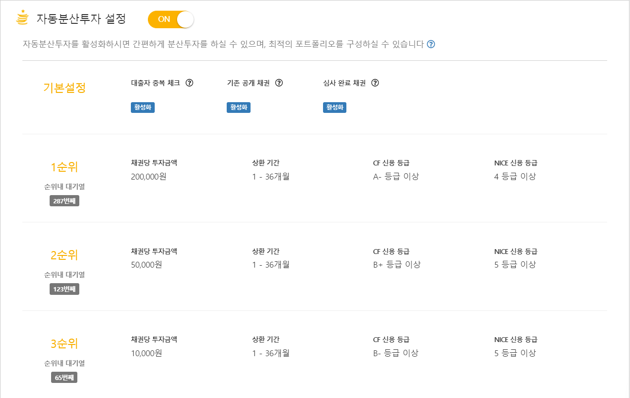 2) 자동투자 활성화한 이후에 밑에 [수정]에서 기본설정 및 선순위 내용사항들을 수정한다.
