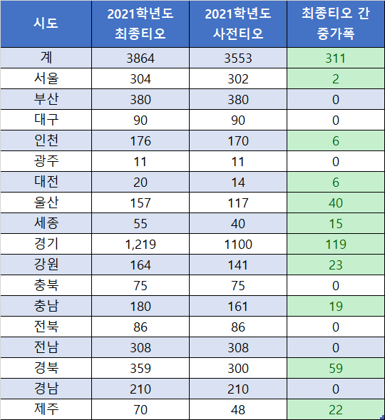 저번에 공시한 2021사전티오와 2021최종티오를 우선 먼저 비교해보겠습니다. 위에 표를 보시면 아시겠지만 사전예고에 비해 약간의 변화가 있습니다. 대부분의 예측과 마찬가지로 사전예고보다는 본티오에서 전체적인 숫자가 늘어났습니다. 특히 울산, 경북과 경기에서 상당부분 증가한 것을 알 수 있습니다. 또한 인원 대비로 따지자면 세종과 제주 역시 상당히 증가하였습니다.