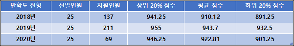 2020학년도 만학도 전형의 점수는 하위 20% 성적을 기준으로 잡았을 때, 1000점 만점 중 901.250점을 맞았습니다. 이 점수는 18학년도에 비하면 오른 수치이지만 19학번에 비하면 급락한 것을 확인할 수 있습니다.